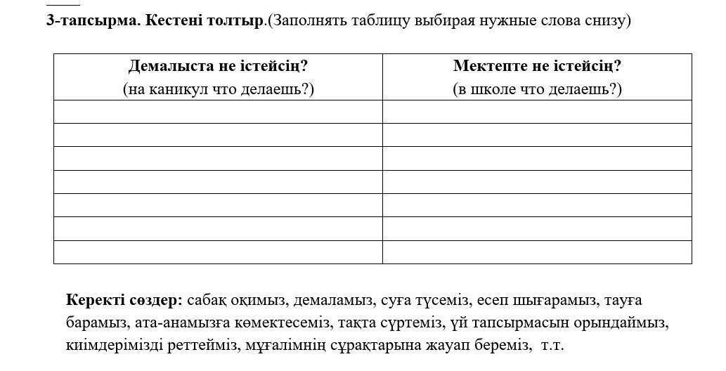 Демаламыз,Суға түсеміз,тауға барамыз,ата-анамызға көмектесеміз.