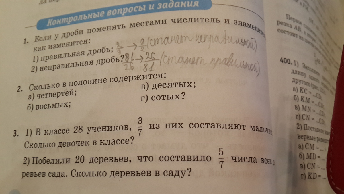 Что же ты спрашиваешь и сама же ставишь нарушение. Ты же ответов не знаешь. При ответе на 2 вопрос у меня глючил интернет и исчезла часть текста, а 3/7 вверх подскочили к 5/10.А исправить не могла.Сейчас не могу редактировать, т.к. написано нарушение. А в 1 примере что не нравиться? Прочитай внимательно : половина (1/2) - это две четверти, половина - это четыре восьмых, половина - это пять десятых, ...