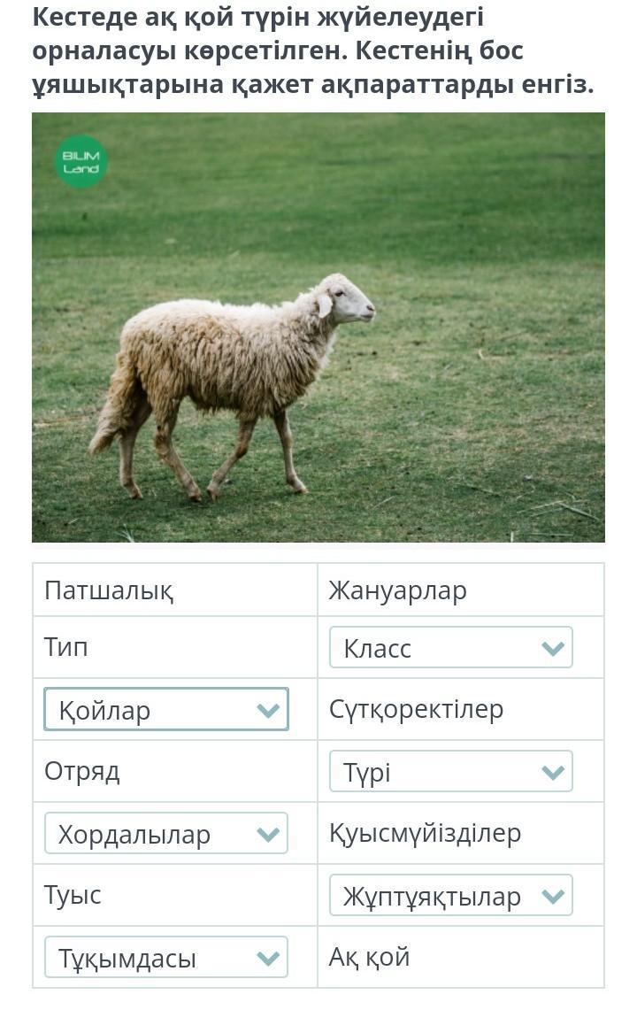 Кестеде ақ қой түрін жүйелеудегі орналасуы көрсетілген. Кестенің бос ұяшықтарына қажет ақпараттарды енгіз.это не правильный ответ помогитеее