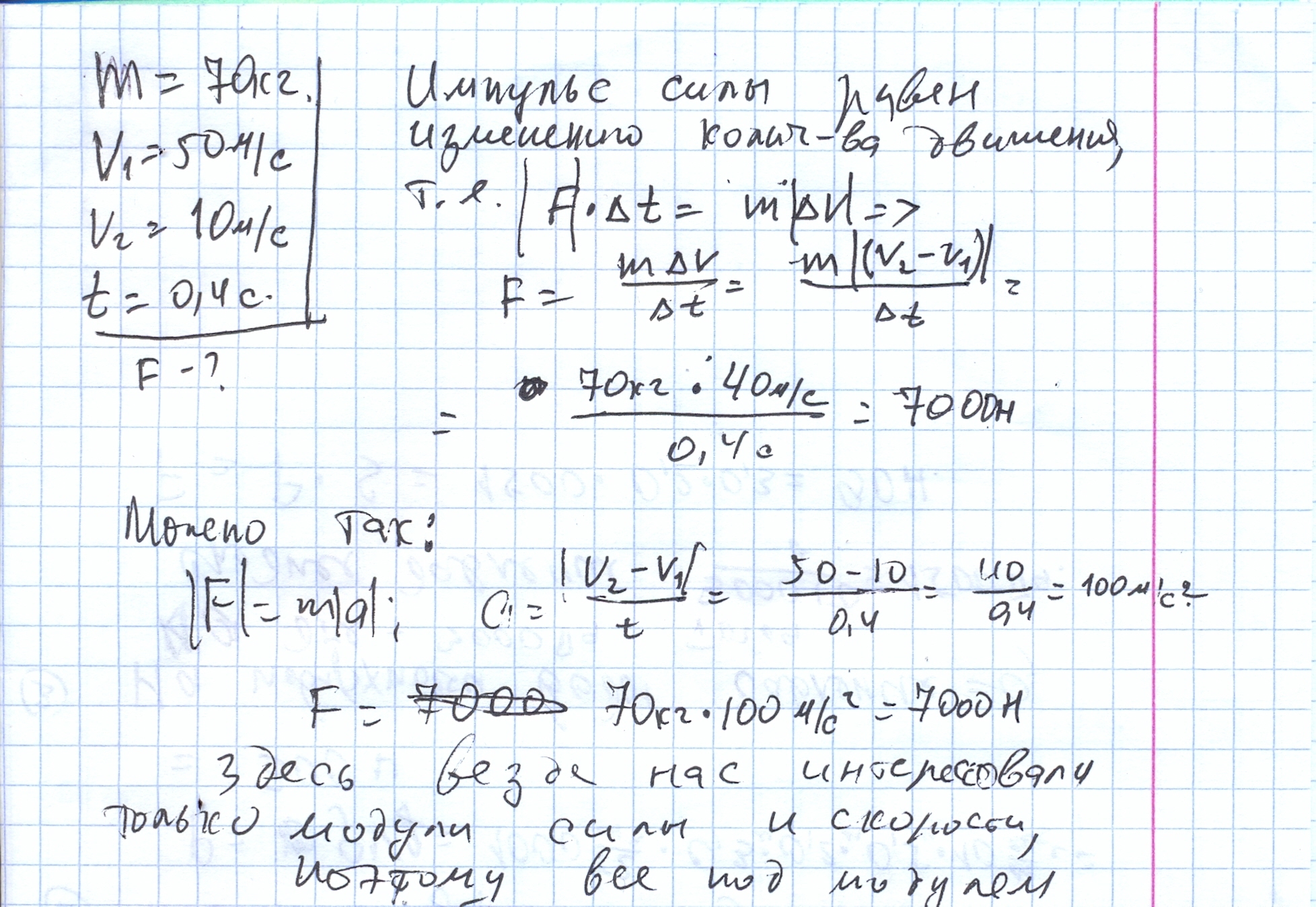 скорость парашютиста массой 70 кг во время раскрытия парашюта уменьшилась от 50 до 10 м/с.Определите среднюю силу удара при раскрытии парашюта, если время торможения 0,4 с