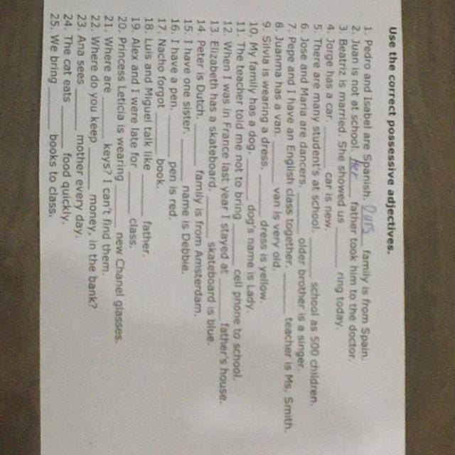 7. Pepe and I have an English class together. teacher is Ms. Smith.