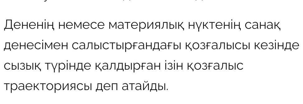 Ответ:Бөлшек қозғалғанда сипаттайтын сызықты қозғалыс траекториясы деп атайды. ... түзу қозғалыс, бұл жағдайда нүктенің траекториясы түзу болады; және қисық қозғалыс (жол - қисық сызық
