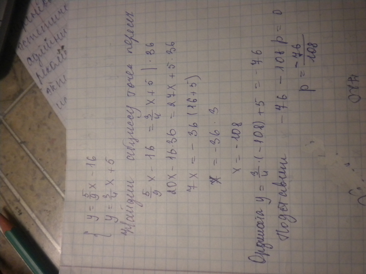 При каком значении p график уравнения y+px=0 пройдёт через точку пересичения прямых y=59x - 16 и y=34x + 5?