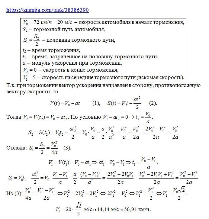 Автомобиль начал торможение при скорости 72 км/ч. Какова его скорость после прохождения половины тормозного пути?