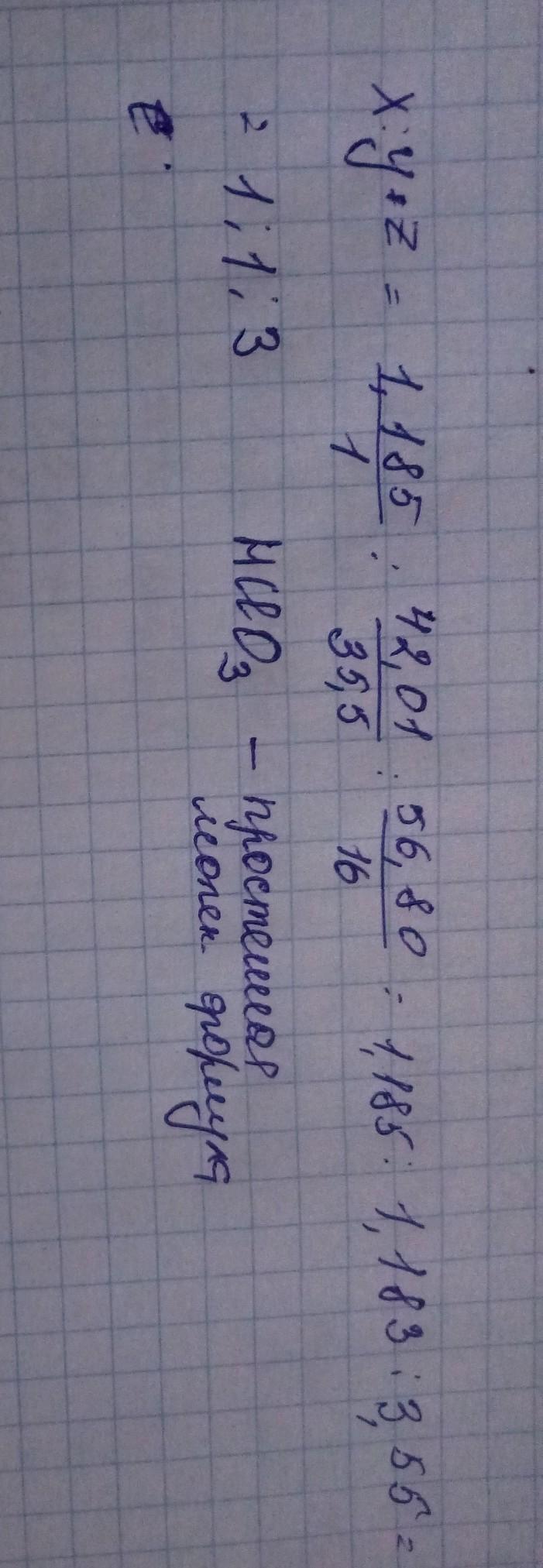 Установите простейшую химическую формулу вещества, если массовые доли водорода, хлора и кислорода соответственно 1,185%, 42,01%,56,80%.
