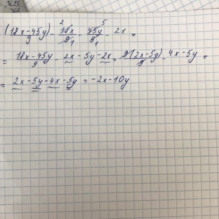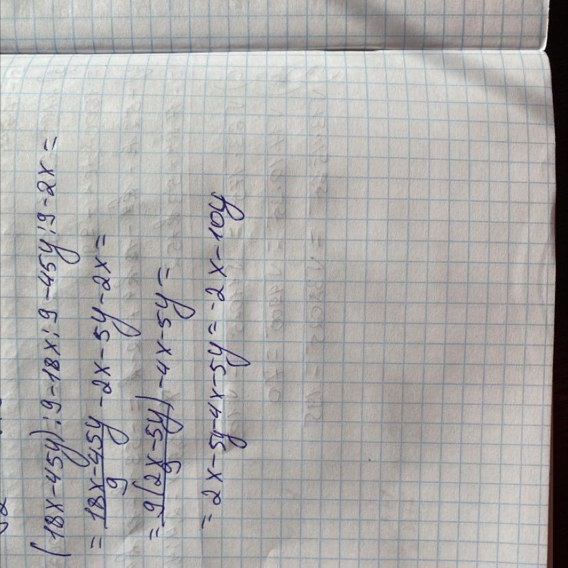 Сначала сокращаешь 18 и 9, потом 45и 9, у тебя получается ответ , дальше приводишься подобные члены, и сокращаешь 9, у тебя выходит ответ , дальше 2х и 4х подобные , и 5у и 5у подобные , они уничтожаются и получается ответ -2х-10у