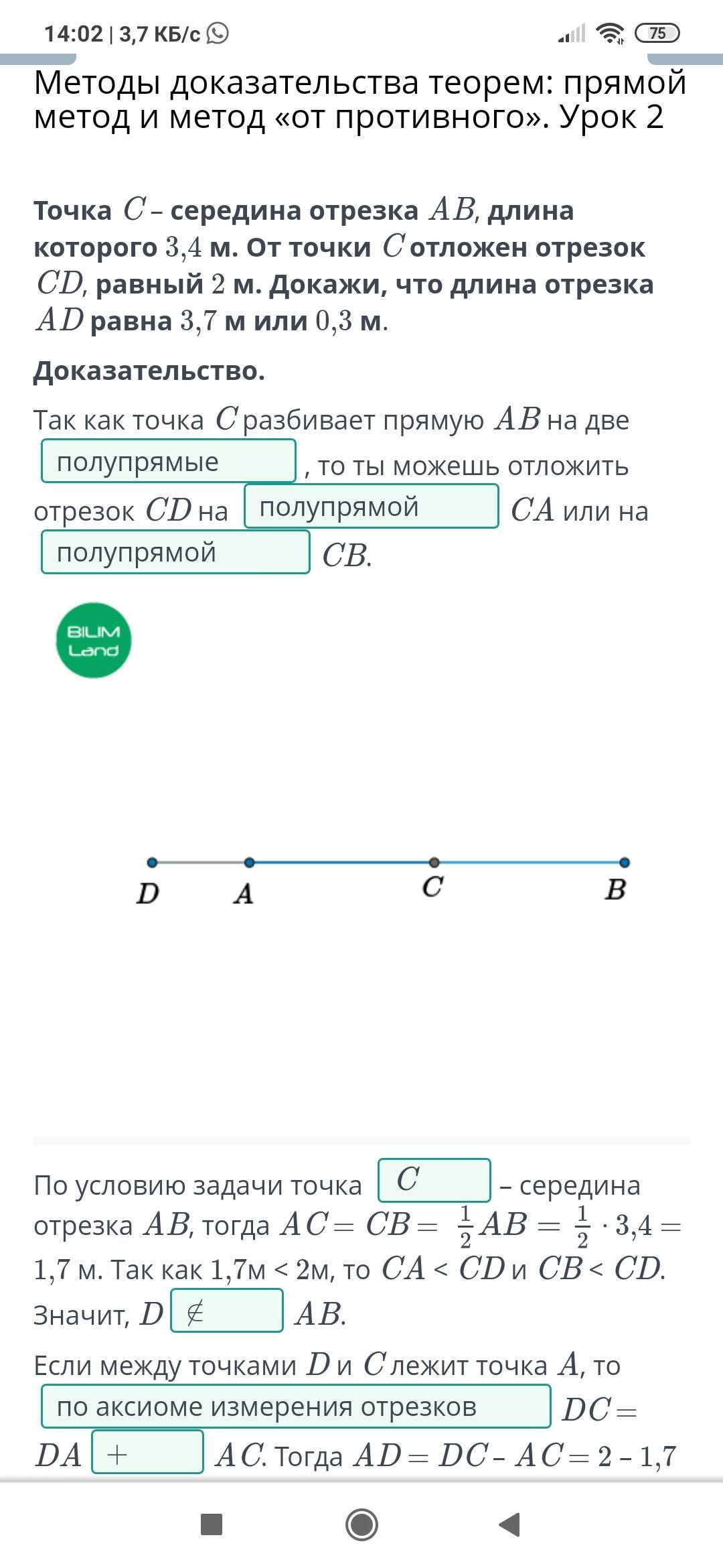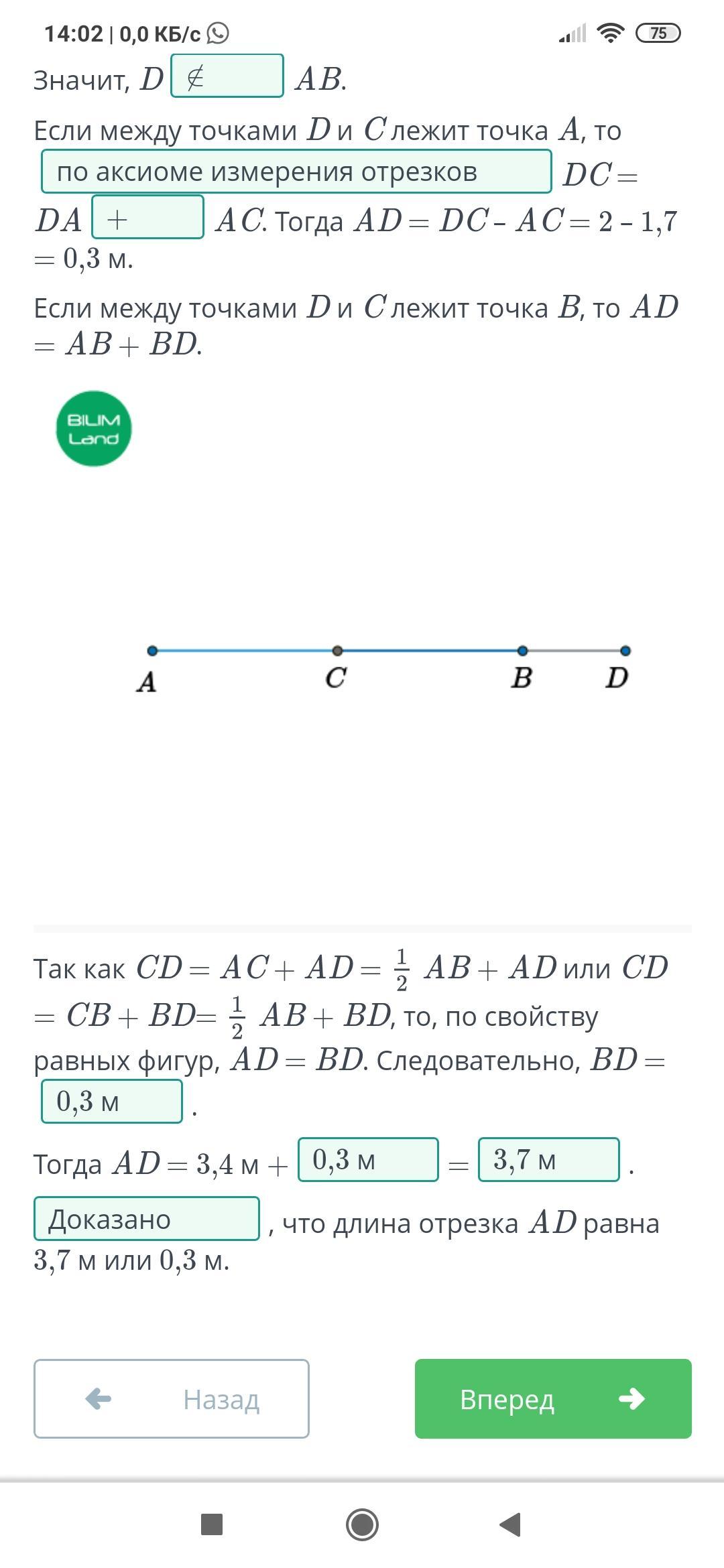 Точка C – середина отрезка AB, длина которого 3,4 м. От точки C отложен отрезок CD, равный 2 м. Докажи, что длина отрезка AD равна 3,7 м или 0,3 м.