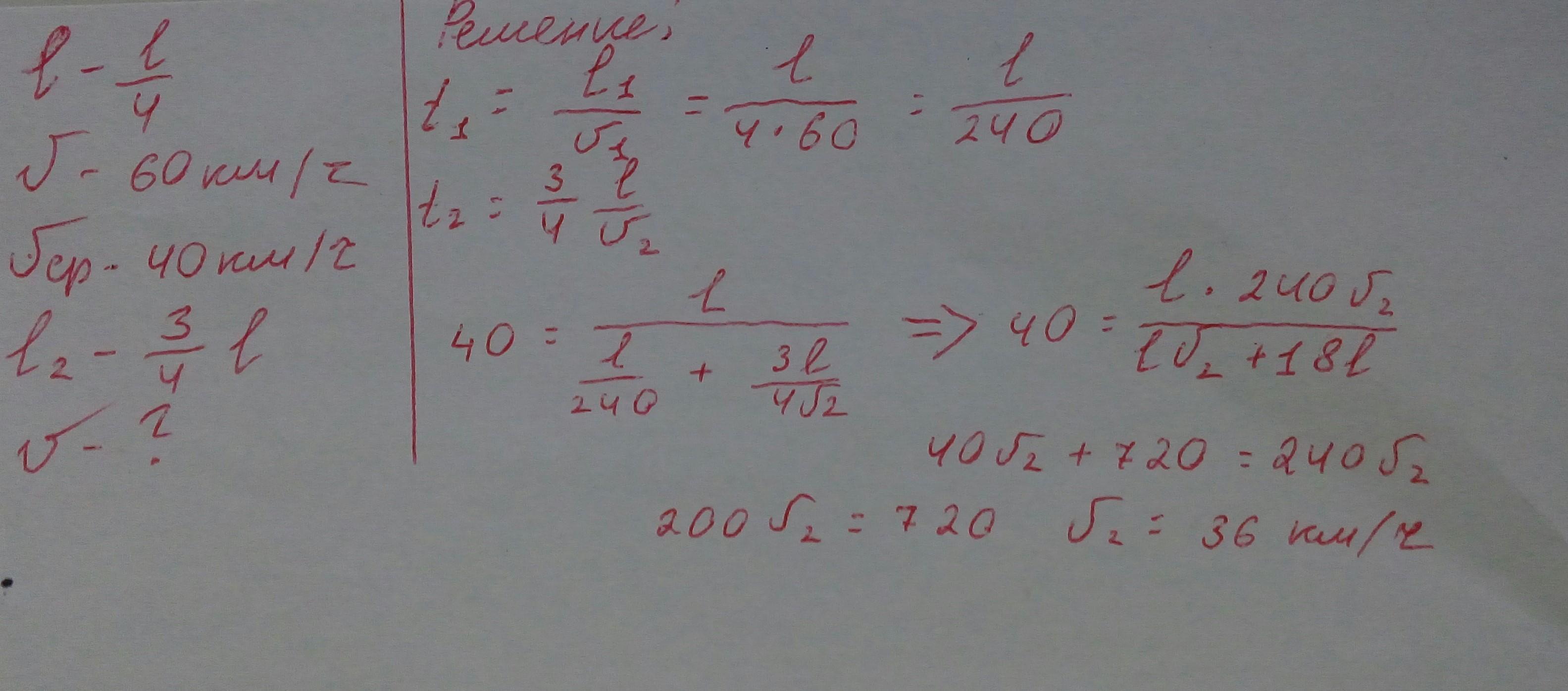 s1=s/4 s2=3*s/4 v1=60 км/ч vcp=40 км/ч v2=?