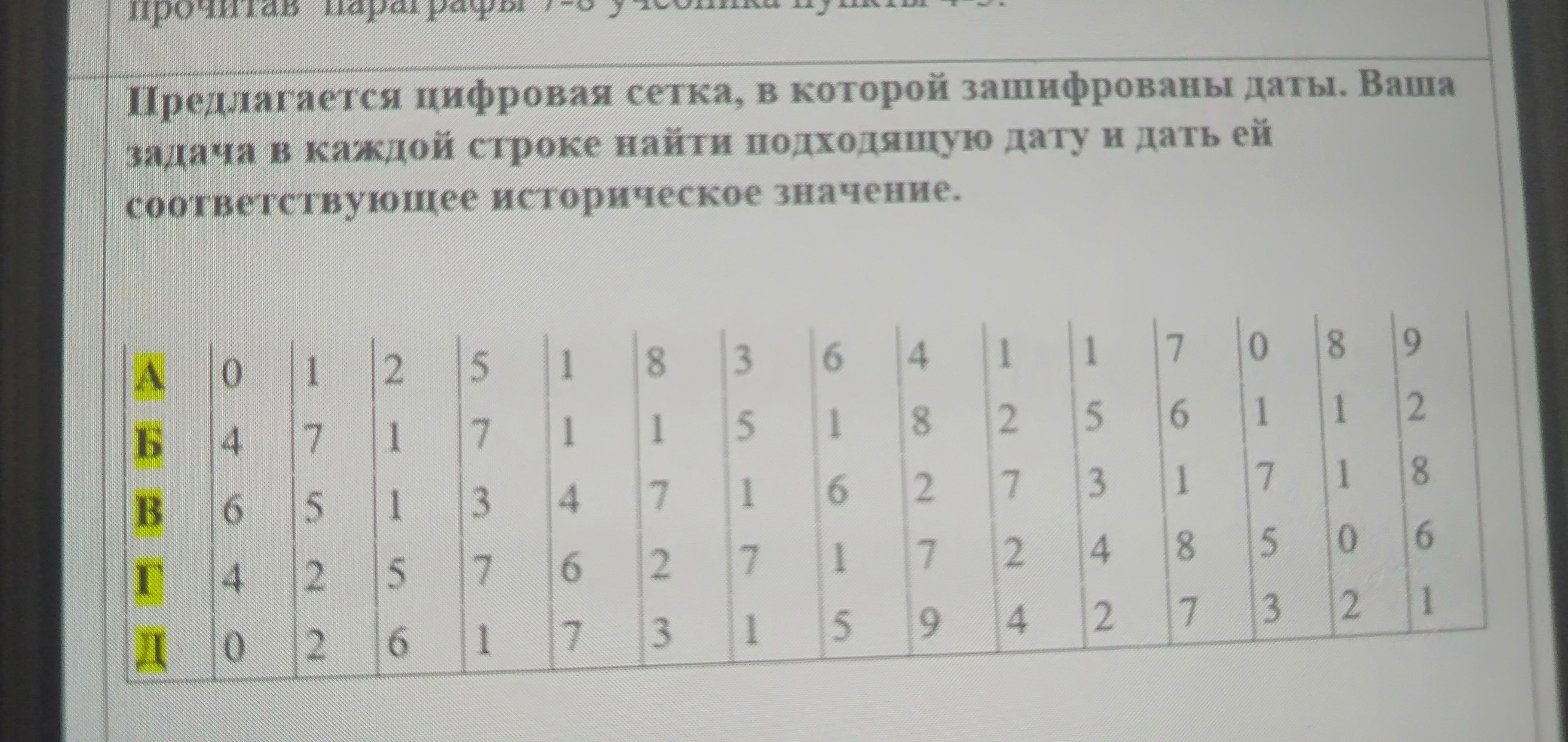 Предлагается цифровая сетка, в которой зашифрованы даты. Ваша задача в каждой строке найти подходящую дату и дать ей соответствующее историческое значение