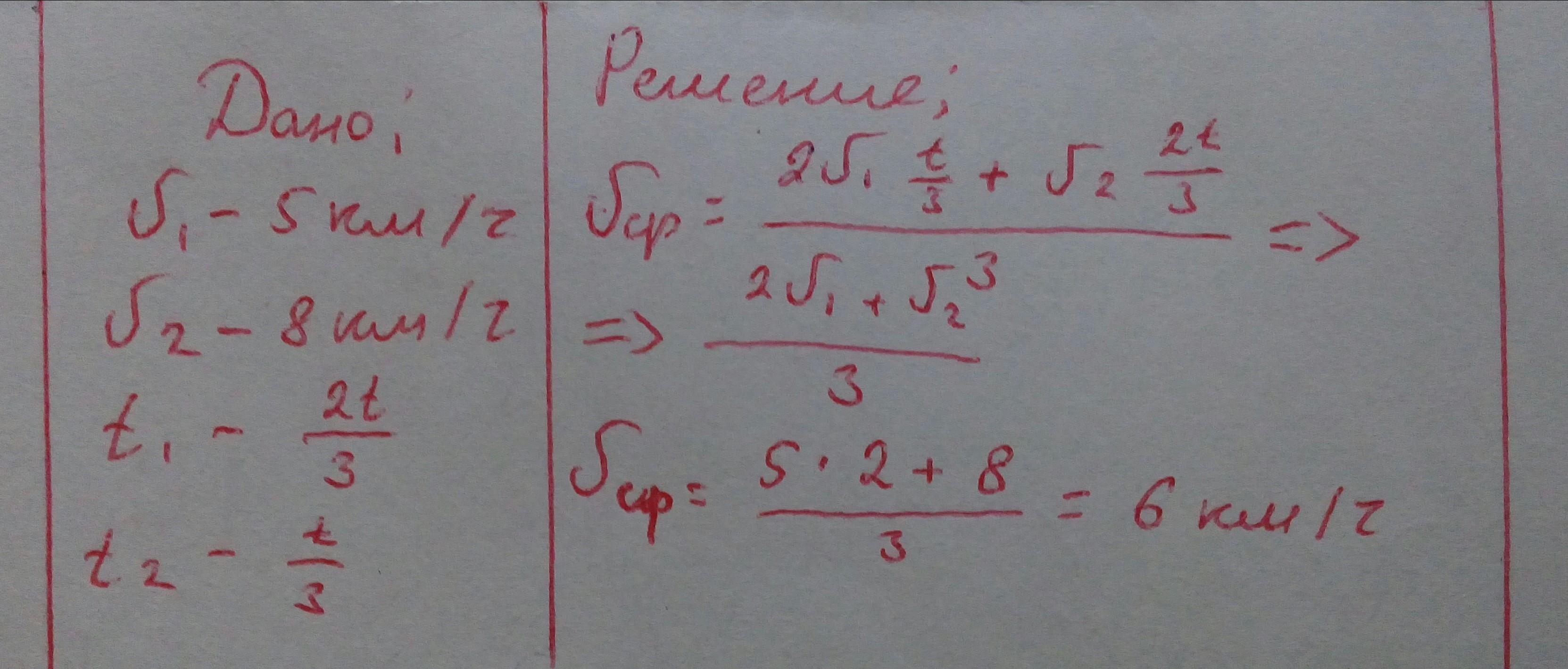 Пешеход часть пути прошёл со скоростью 5 км/ч, затратив на это две трети времени своего движения. За оставшееся время он прошёл остальной путь со скоростью равной 8 км/ч. Определите среднюю скорость пешехода на всём пути.