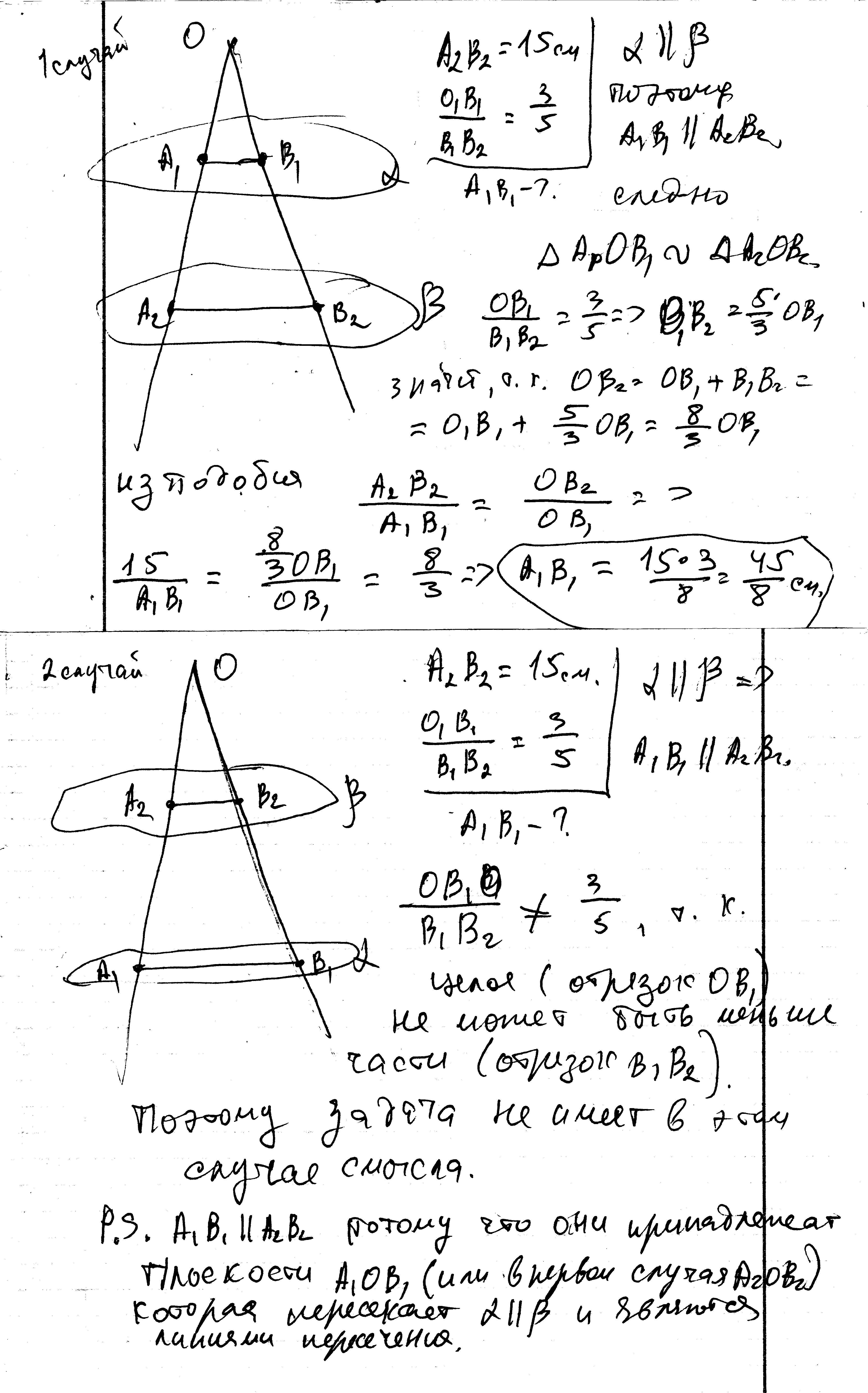 Через точку O, не лежащую между параллельными плоскостями альфа и бета, проведены прямые l и m. Прямая l пересекает плоскости альфа и бета в точках A1 и A2 соответственно, прямая m плоскость альфа и бета в точках B1 и B2. Найдите длину отрезка A1B1, если A2B2 = 15 cм.