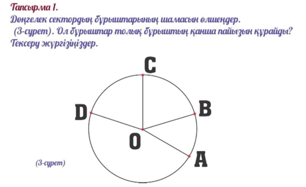 дөңгелек сектордың бұрыштарының шамасымен өлщеңдер. Ол бұрыштар толық бұрыштың қанша пайызын құрайды? Ткнсеру жүргізңіздер