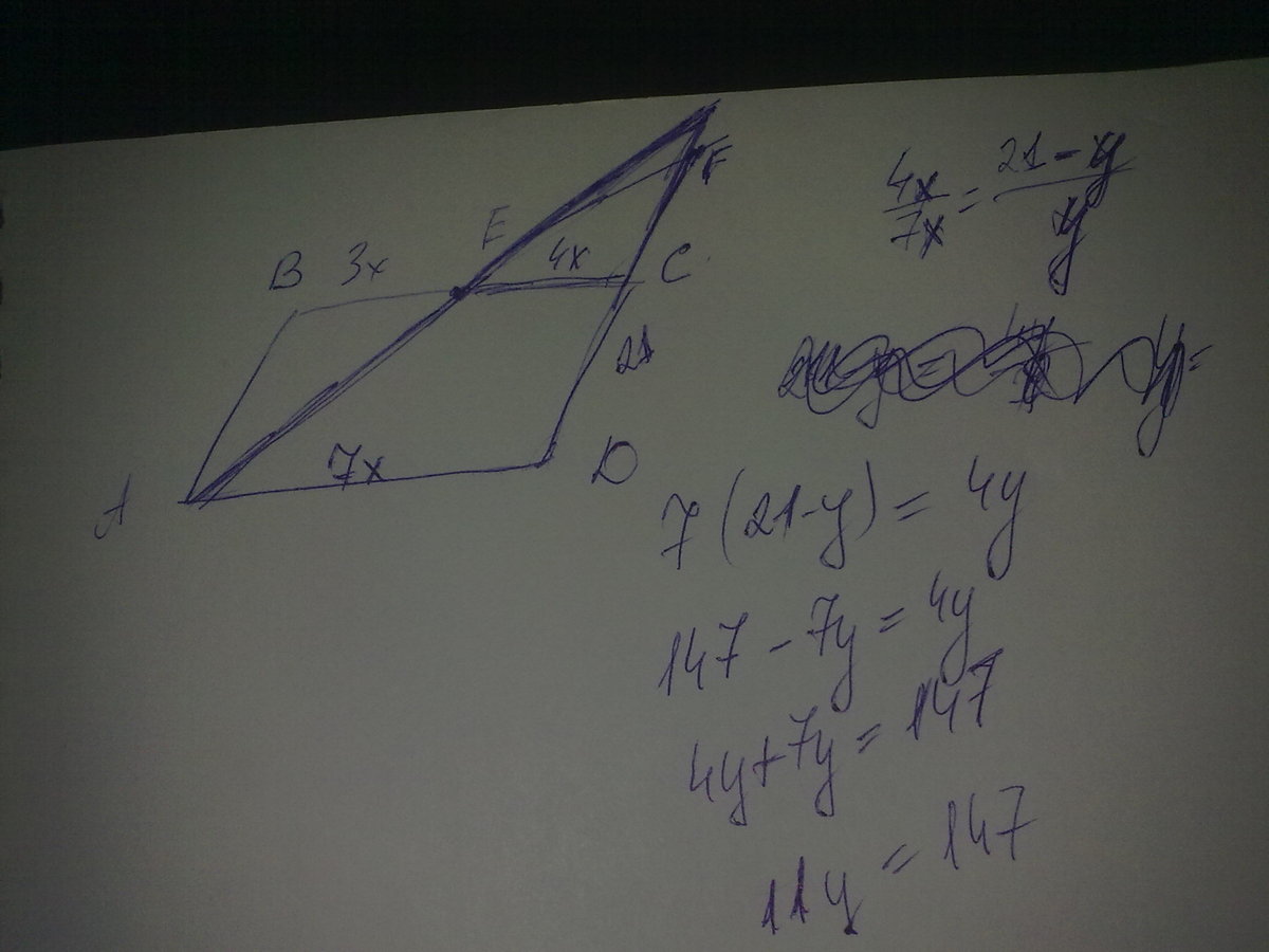 дан паралелограм ABCD из вершины А проведена прямая которая пересекает BC в точке Е, потом продлеваем DC и прямая из точки А пересекает её в точке F. найти AB если BE:EC=3:4 и DF=21 см помогите пожалуйста !!!очень надо ! !!