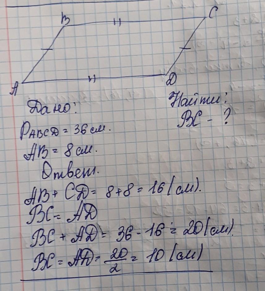Периметр параллелограмма 36см,одна из сторон равна 8 см. Найдите большую сторону параллелограмма.