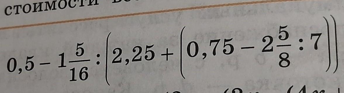 0,5 - 1,5/16 : (2,25 + (0,75 - 2,5/8:7)) = 1/2 - 21/16 : (9/4 + 3/4 - 3/8)) = 1/2-21/16 : (9/4 + 3/8) = 1/2 - 21/16 : 21/8 = 1/2 - 21•8/21 = 1/2 - 1/2 = 0.