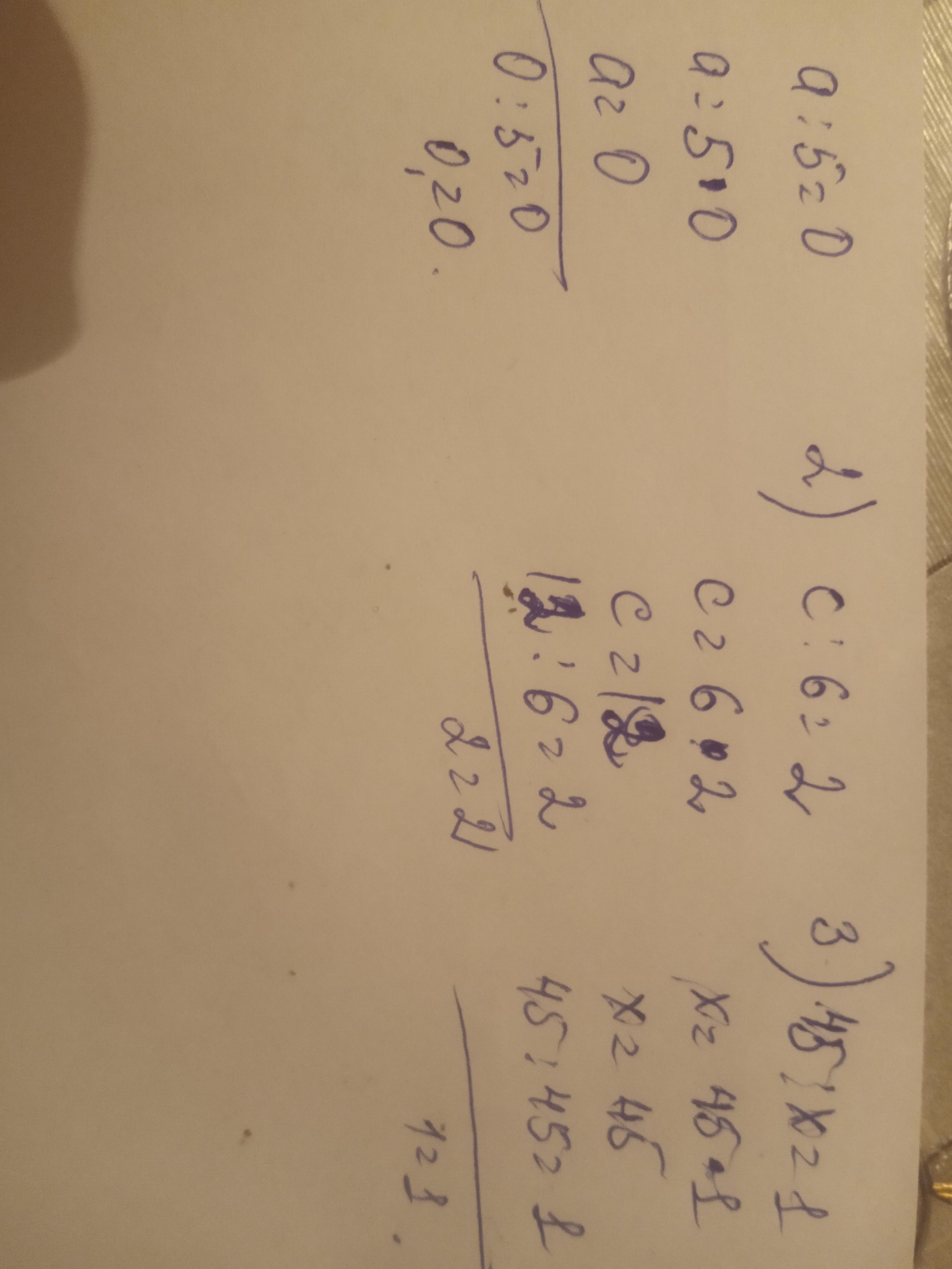 1) а : 5 = 0 2) с : 6 = 2 3) 45 : х = 1
