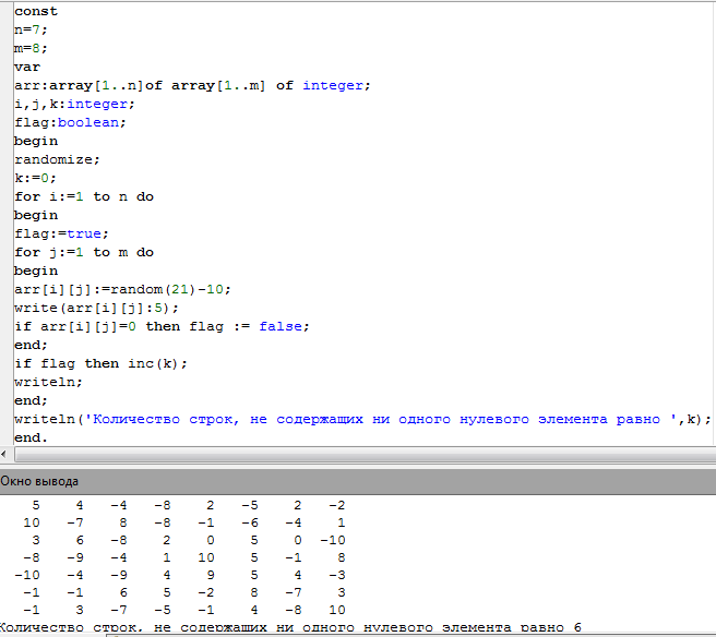 Дана целочисленная прямоугольная матрица. Определить количество строк, не содержащих ни одного нулевого элемента.