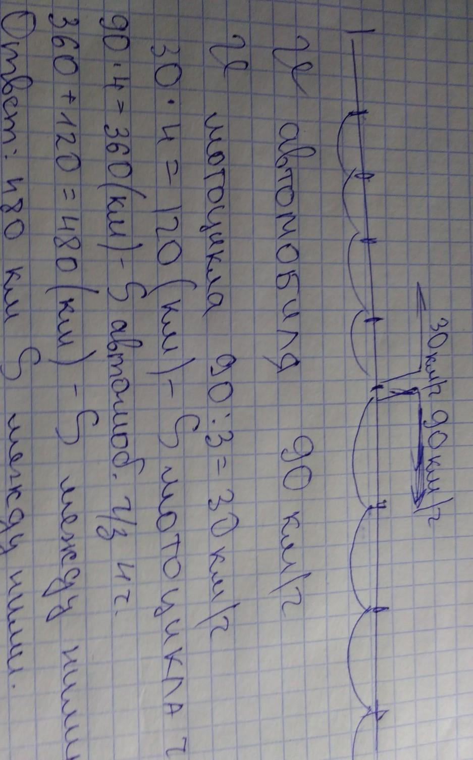 Из одного города в противоположных направлениях выехали автомобиль и мотоцикл.Скорость автомобиля 90 км\ч,что в 3 раза больше скорости мотоцикла. Какое расстояние будет между ними через 4 часа