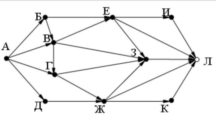 на рисунке схема дорог связывающих города А Б В Г Д Е Ж З и К по каждой дороге можно двигаться только в одном направлении, указанном стрелки. Сколько существует различных путей из города А, в город Л? Решите пожалуйста