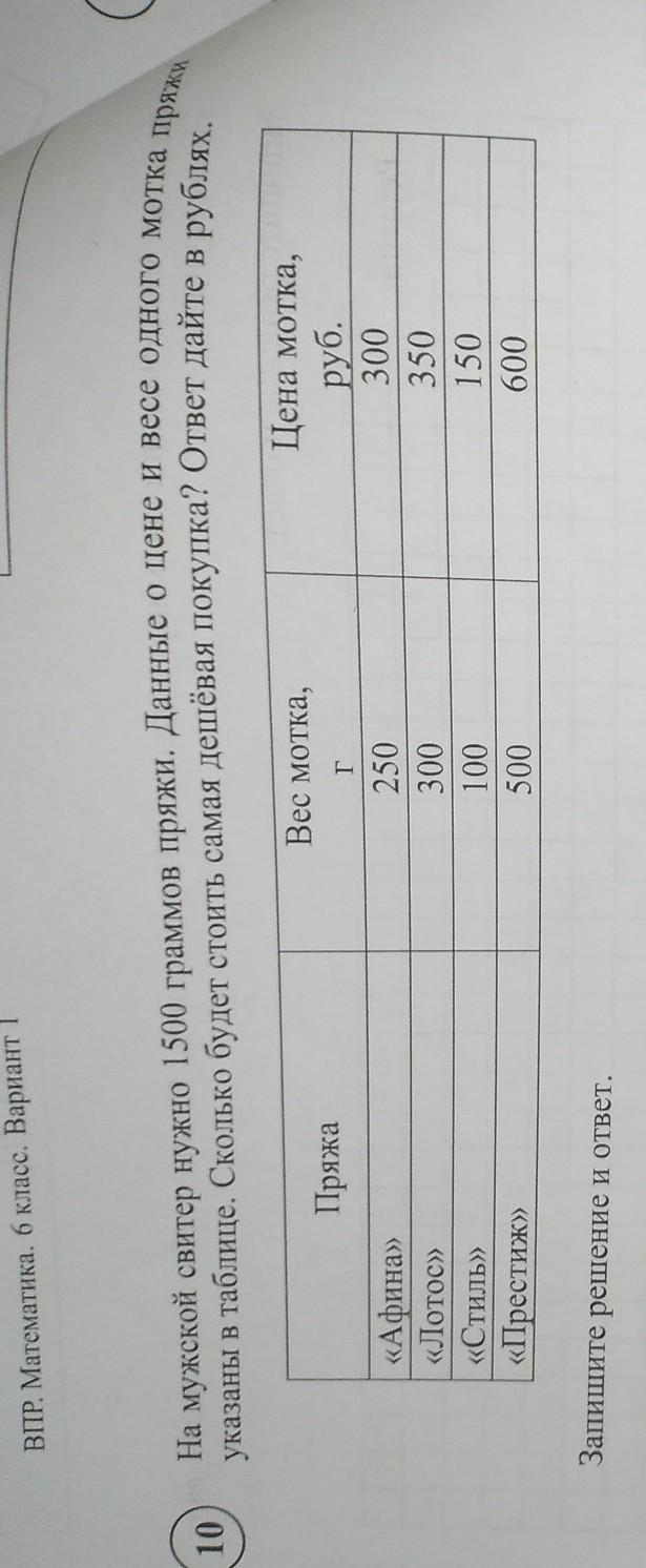 На мужской свитер нужно 1500 ткани пряжи. Данные о цене и весе одного мотка пряжи указаны в таблице. Сколько будет стоить самая дешёвая покупка? Ответ дайте в рублях.