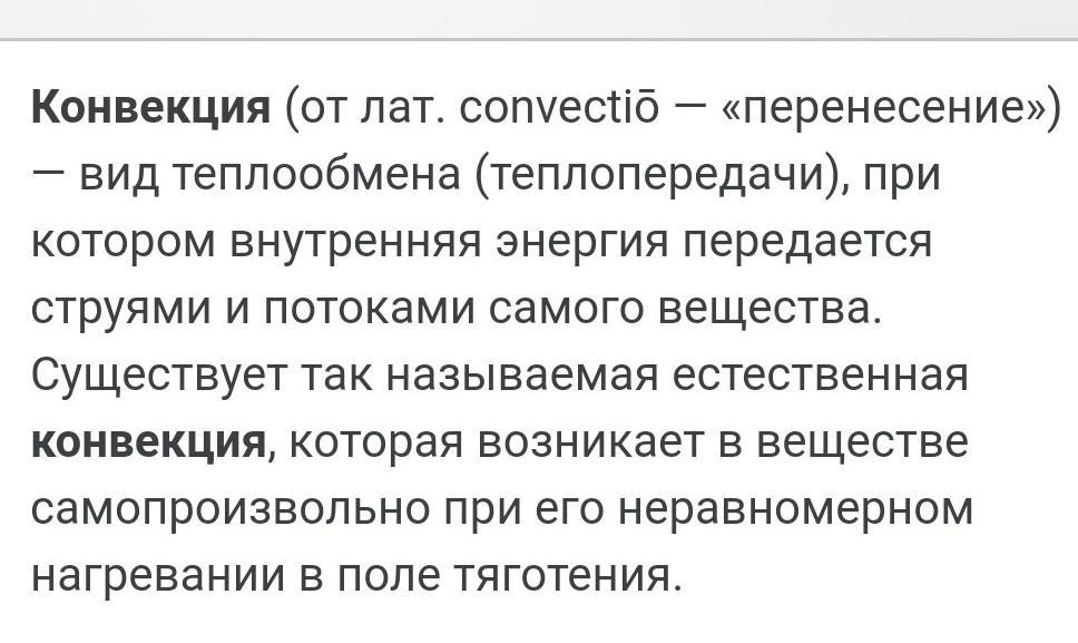 Конвекция (от лат. convectiō — «перенесение») — вид теплообмена (теплопередачи), при котором внутренняя энергия передается струями и потоками самого вещества. Существует так называемая естественная конвекция, которая возникает в веществе самопроизвольно при его неравномерном нагревании в поле тяготения.