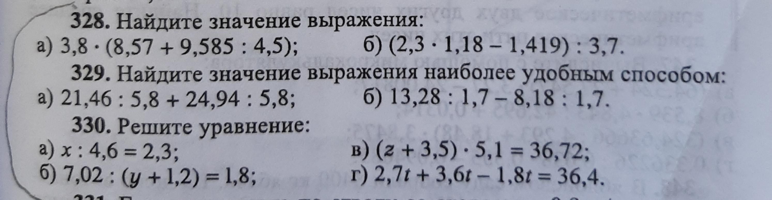 329) а - (21,46 + 24,94) : 5,8; б - (13,28 - 8,18) : 1,7