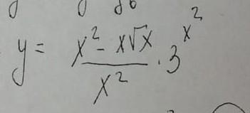 y'=(\frac{x^2-x\sqrt{x} }{x^2} 3^{x^2})' = ((1- x^{-\frac{1}{2} })3^{x^2})'= \frac{3^{x^2}x^{-\frac{3}{2} }}{2}  +2ln(3)x3^{x^2}(1-x^{-\frac{1}{2} })