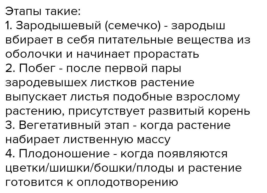 Развитие растений делят на 5 этапов: 1 — эмбриональный — от оплодотворения до прорастания зародыша; 2 — молодости — от прорастания семени до закладки цветочных органов, когда быстро увеличивается число и размеры вегетативных органов; 3 — зрелости — от момента закладки цветочных органов до оплодотворения; 4 — размножения — от оплодотворения до созревания семян; 5 — старости — от периода созревания семян до отмирания.