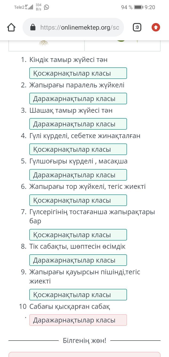 Төменде даражарнақты және қосжарнақты өсімдіктерінің суреттері берілген. Суреттегі өсімдік белгілеріне назар аударып,берілген тұжырымдамалардың ішінен әр класс өкілінің өзіне тән ерекшеліктерін ажыратып, реттік номерін сол класс өкілі берілген кестеге орналастыр.