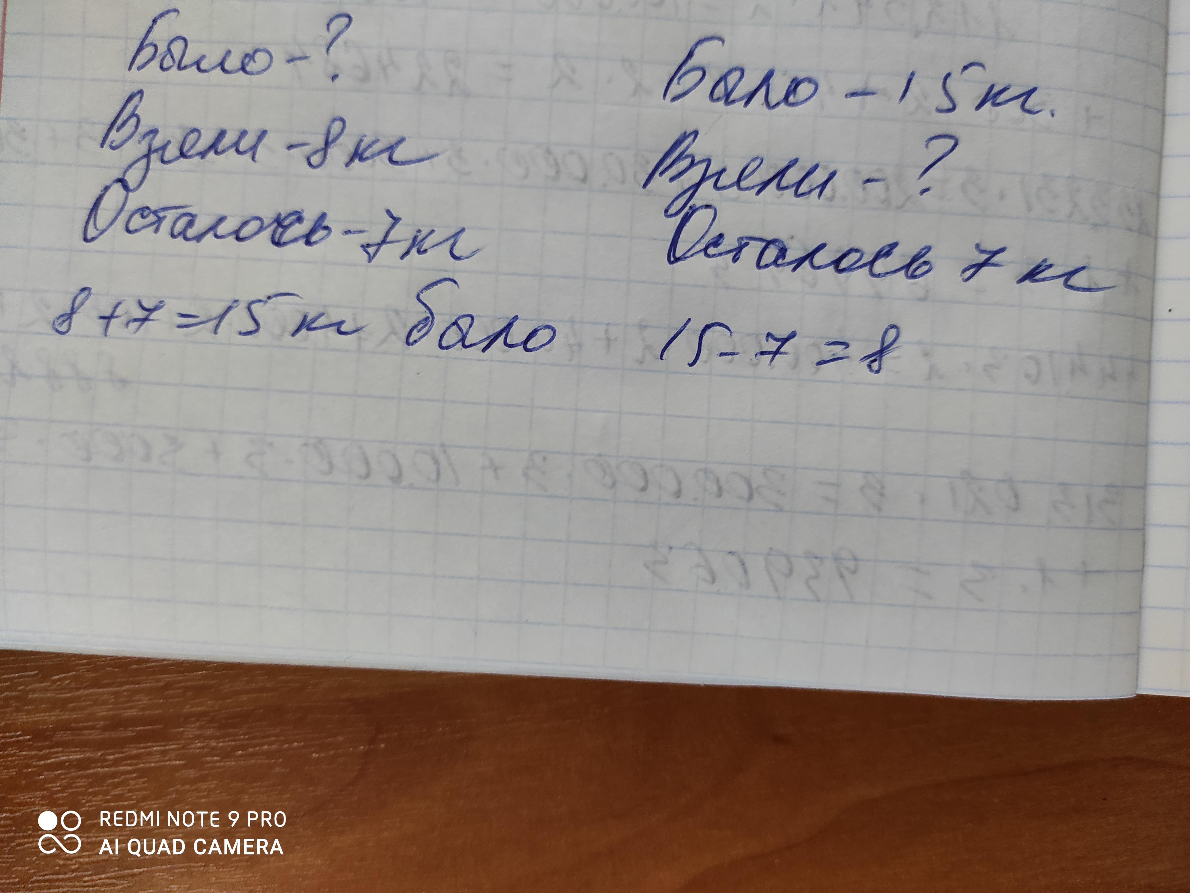 Взяли 8 кг осталось7 сколько 8+7=15. Следующие было 15 осталось 7 сколько взяли 15-7=8 следующие 15 было 8 взяли сколько осталось 15-8=7