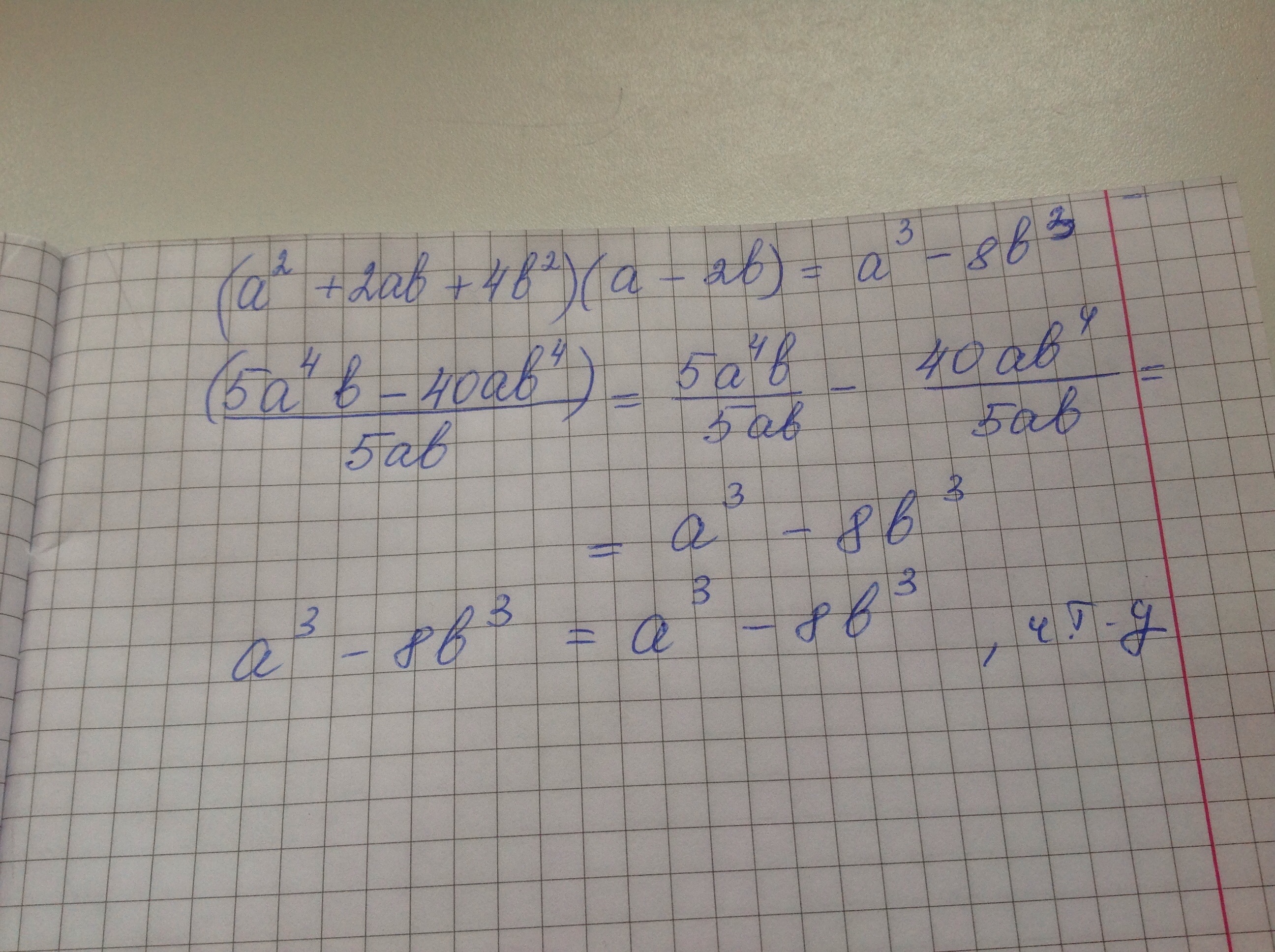 доказать что произведение многочленов a(во второй степени)+2ab+4b(во второй степени) и a-2b равно частному от деления многочлена 5a(в четвёртой степени)b-40ab(в четвёртой степени) на одночлен 5ab