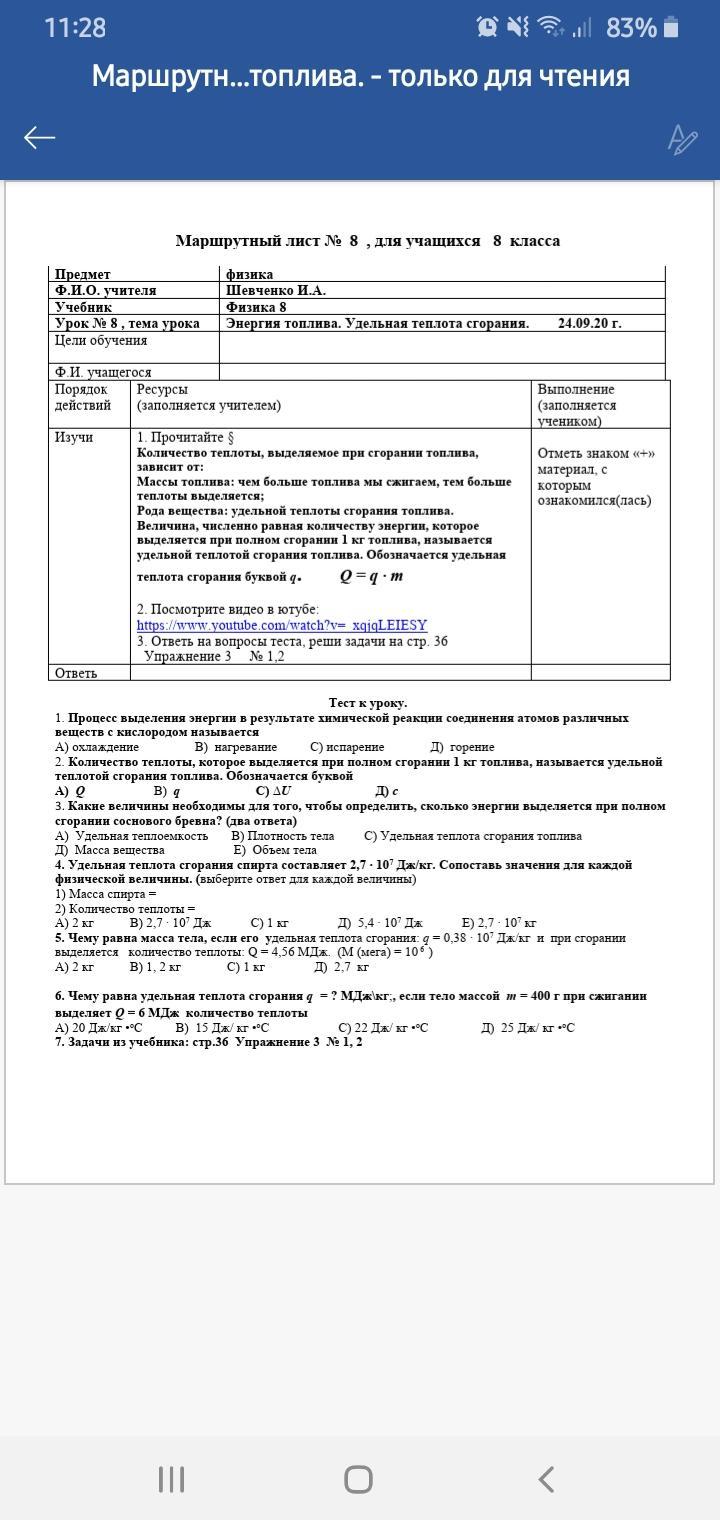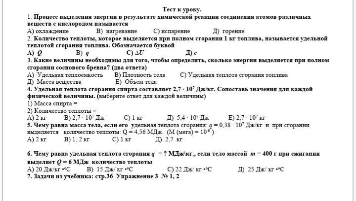 Ответ: 1.горение 2. q (маленькая) 3.масса вещества, удельная теплота сгорания топлива. 4. масса- С), кол-во - В) 5. 1,2 кг. 6. В)