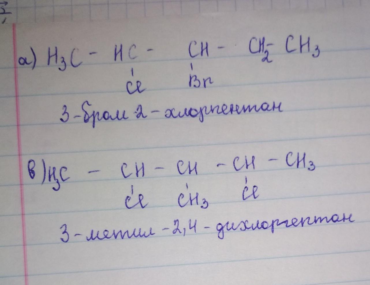 Напишите формулу строения следующих соединений a) 3-бром-2-хлорпентан b) 3-метил-2,4-дихлоргептан