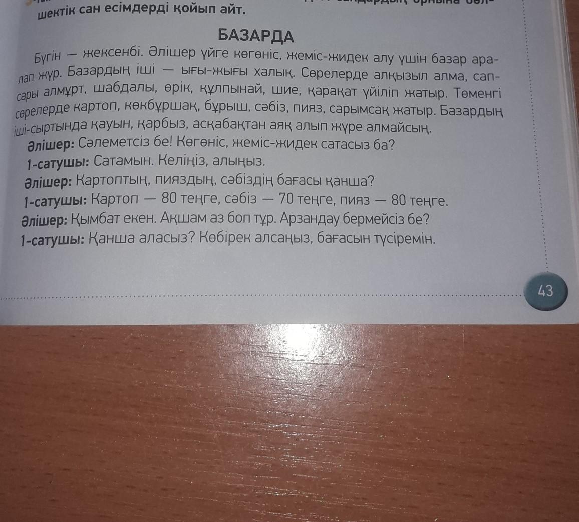 Сегодня воскресенье. Алишер пошел на рынок что бы купить овощи и фрукты. Рынок был переполнен . На полке были красные яблоки,жёлтые груши,персики, абрикосы, клубника, вишня, смородина. В нижних полках были картошка, перец,горох,морковь,лук, чеснок.внутри и вне рынка стоят дыня,арбуз, и тыквы что невозможно ходить.