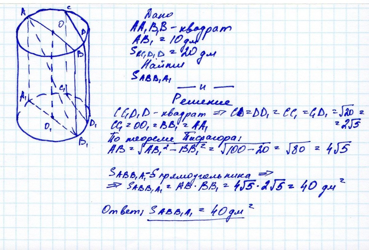 Сечением цилиндра плоскостью, параллельной оси, служит квадрат, площадь которого равна 20 дм квадратных. Найдите площадь осевого сечения цилиндра, если его диагональ равна 10 дм.
