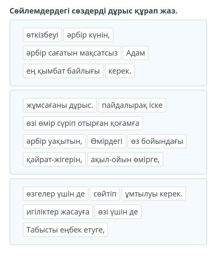 Сөйлемдердегі сөздерді дұрыс құрап жаз.