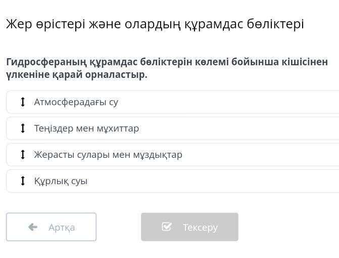 Гидросфераның құрамдас бөліктерін көлемі бойынша кішісінен үлкеніне қарай орналастыр