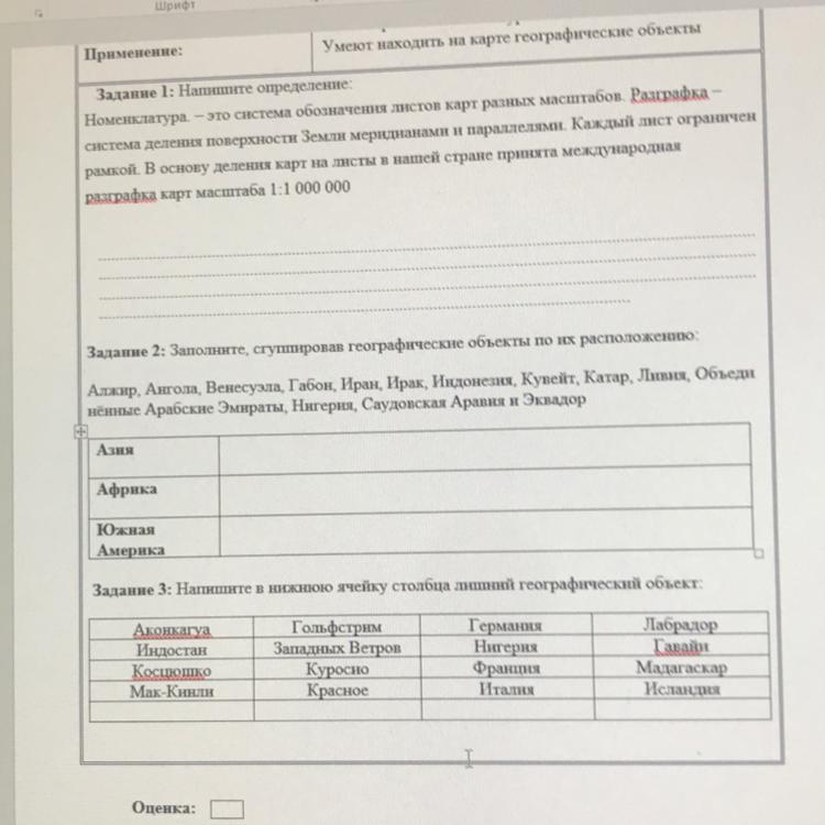 Задание 2: Заполните, сгуппировав географические объекты по их расположению: