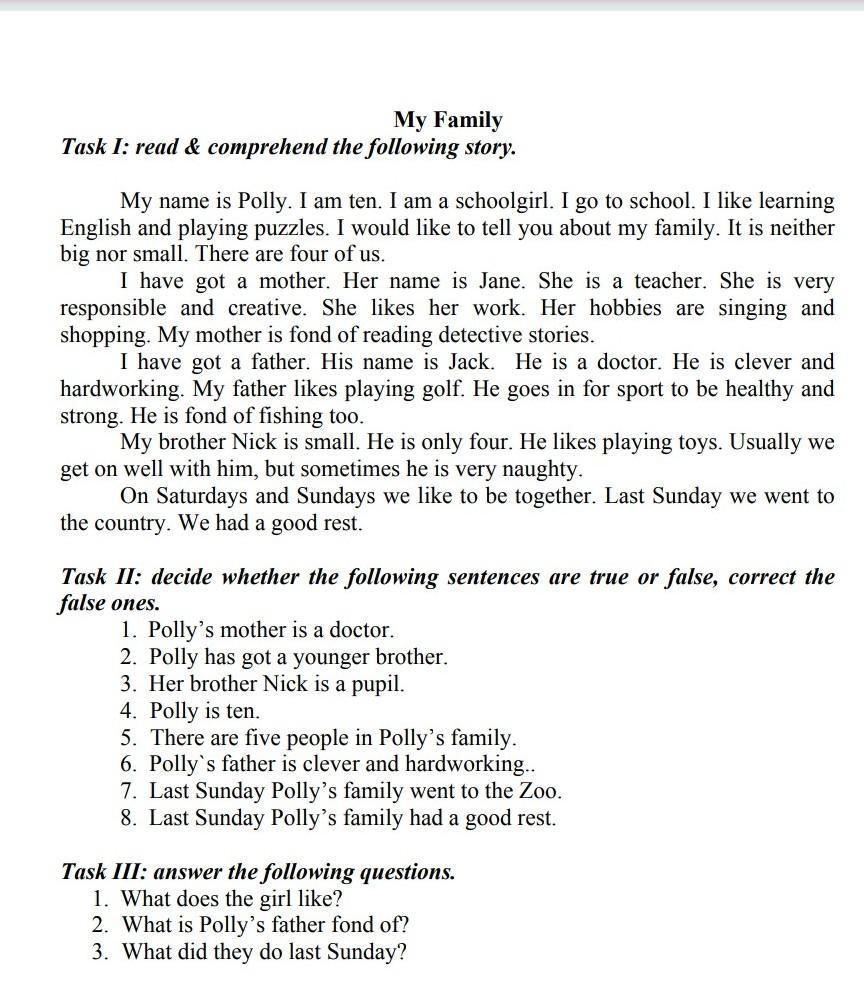 Моя семейная задача I: прочитать и понять следующую историю. Меня зовут Полли. Мне десять. Я школьница. Я хожу в школу. Мне нравится учить английский и играть в головоломки. Хочу рассказать о своей семье. Он ни большой, ни маленький. Есть четыре из нас. У меня есть мать. Ее зовут Джейн. Она учитель. Она очень ответственная и креативная. Ей нравится ее работа. Ее хобби - пение и шоппинг. Моя мама любит читать детективы. У меня есть отец. Его зовут Джек. Он доктор. Он умен и трудолюбив. Мой отец любит играть в гольф. Он занимается спортом, чтобы быть здоровым и сильным. Он тоже любит рыбалку. Мой брат Ник маленький. Ему всего четыре года. Ему нравится играть в игрушки. Обычно мы с ним хорошо ладим, но иногда он очень непослушный. По субботам и воскресеньям нам нравится быть вместе. В прошлое воскресенье мы ездили на дачу. Мы хорошо отдохнули. Задача II: решить, верны ли следующие предложения или нет, исправить ложные. 1. Мать Полли - врач. 2. У Полли есть младший брат. 3. Ее брат Ник - ученик. 4. Полли десять лет. 5. В семье Полли пять человек. 6. Отец Полли умен и трудолюбив. 7. В прошлое воскресенье семья Поли пошла в зоопарк. 8. В минувшее воскресенье семья Полли хорошо отдохнула. Задача II: ответьте на следующие вопросы. 1. Что нравится девушке? 2. Чем любит отец Полли? 3. Что они делали в прошлое воскресенье?