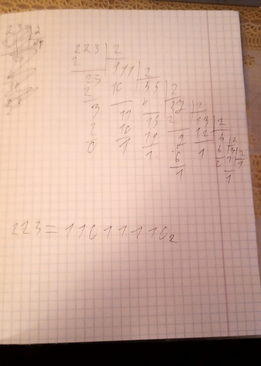 Перевести в двоичную истему число 223. Сделать проверку с помощью перевода получивщегося двоичного числа в десятичную систему.