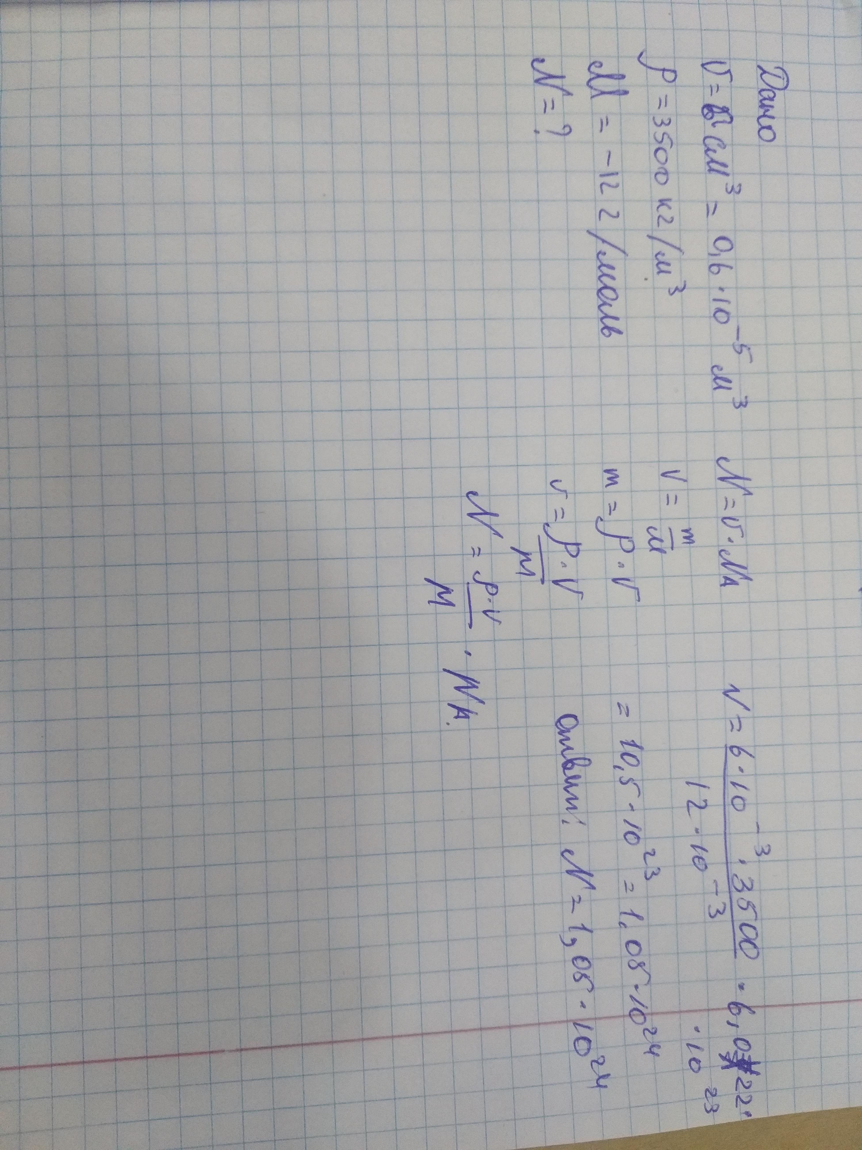 Определите число атомов в 6 см3 алмаза. Плотность алмаза 3500 кг/м3,а молярная масса- 12 г/моль.