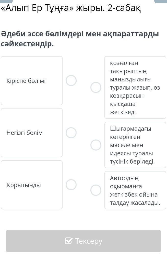 Ответ:Кіріспе бөлім:шығармадағы көтерілген мəселе мен идеясы түралы түсінік береді