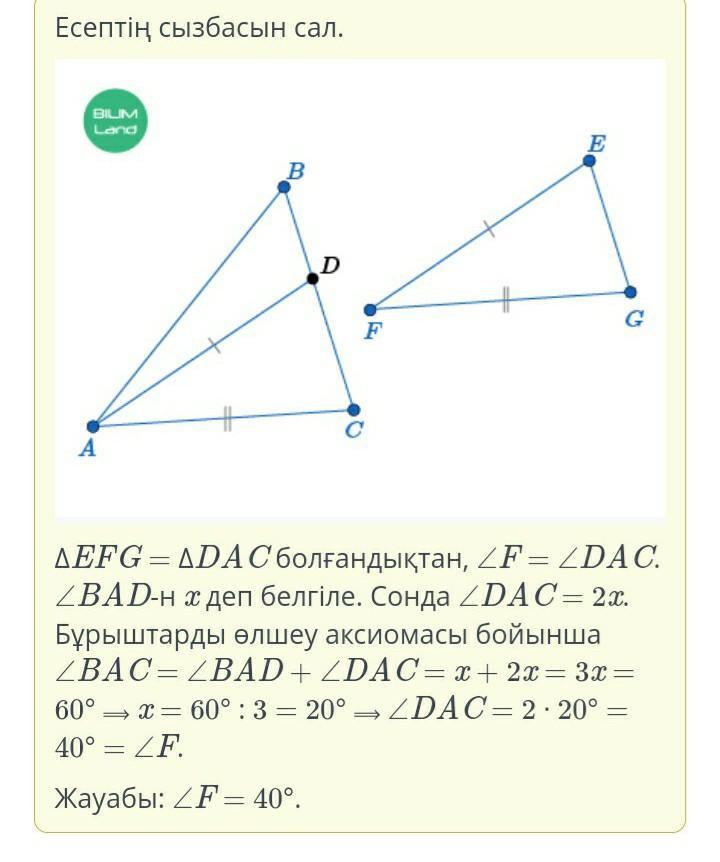 ABC үшбұрышында A бұрышы 60°-қа тең. BC қабырғасынан ∠BAD-ның градустық өлшемі ∠DAC-нан 2 есе кіші болатындай D нүктесі алынған. ΔEFG = ΔDAC. ∠F неге тең?