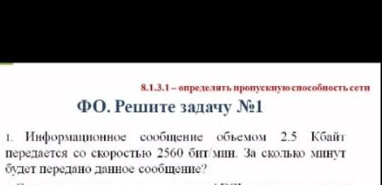 байтов =2560*8 =20480 битов.Чтобы найти за сколько времени передастся данный файл надо весь его размер разделить на скорость с которой он передается:20480/2560=8 минут