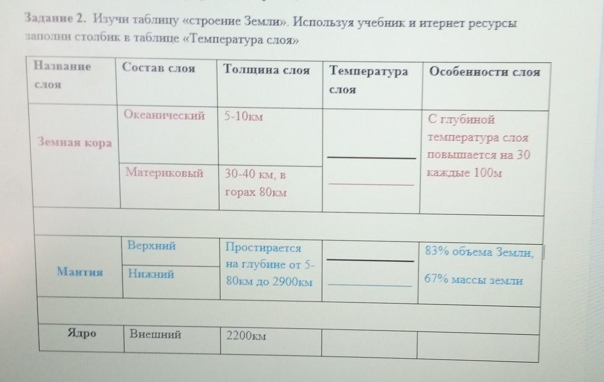 Задание 2. Изучи таблицу «строение Земли». Используя учебник и итернет ресурсы