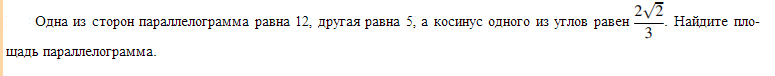Одна из сторон параллелограмма равна 12, другая равна 5, а косинус одного из углов равен (2√2)/3. Найдите площадь параллелограмма.