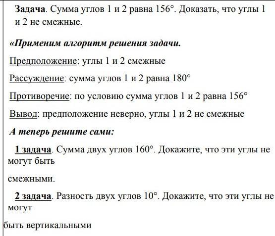 Задача. сумма углов 1 и 2 равна 156°. доказать, что углы 1 и 2 не смежные «применим алгоритм решения задачи предположение углы 1 и 2 смежные рассуждение: сумма углов 1 и равна 180° противоречие по условию сумма углов 1 и 2 равна 156 вывод: предположение неверно, углы 1 и 2 смежные а теперь решите сами: 1 1 задача. сумма двух углов 160°. докажите, что эти углы не не могут быть смежными. 2 задача. разность двух углов 10°. докажите, что эти углы не могут быть вертикальными