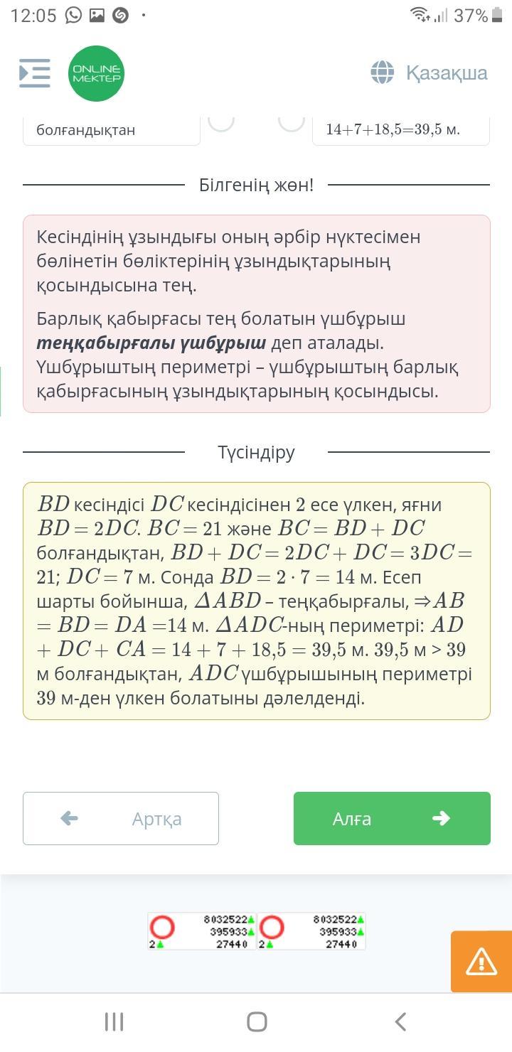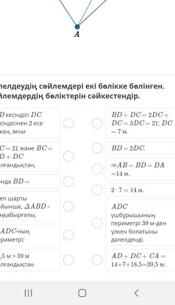 ABC үшбұрышында AC = 18,5 м, BC = 21 м. BC қабырғасынан BD кесіндісі DC кесіндісінен 2 есе үлкен болатындай D нүктесі алынған, ал ABD үшбұрышы – теңқабырғалы. ADC үшбұрышының периметрі 39 м-ден үлкен болатынын дәлелде.