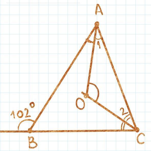 внешний угол при вершине B треугольника ABC равен 102. биссектриса углов A и C треугольника пересекаются в точке O. Найдите величину угла AOC. Дайте ответ в градусах.