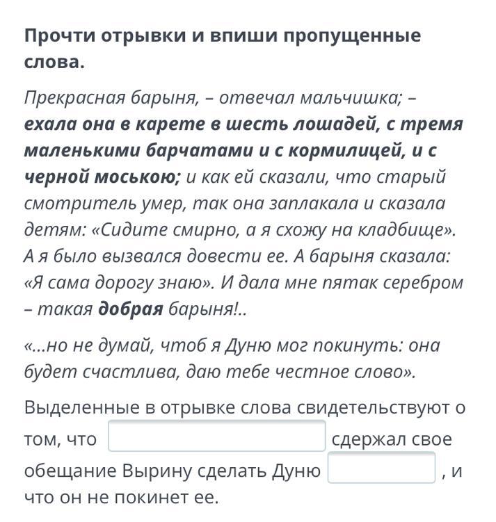 Выделенные в отрывке слова свидетельствуют о том, что сдержал свое обещание Вырину сделать Дуню, и что он не покинет ее.